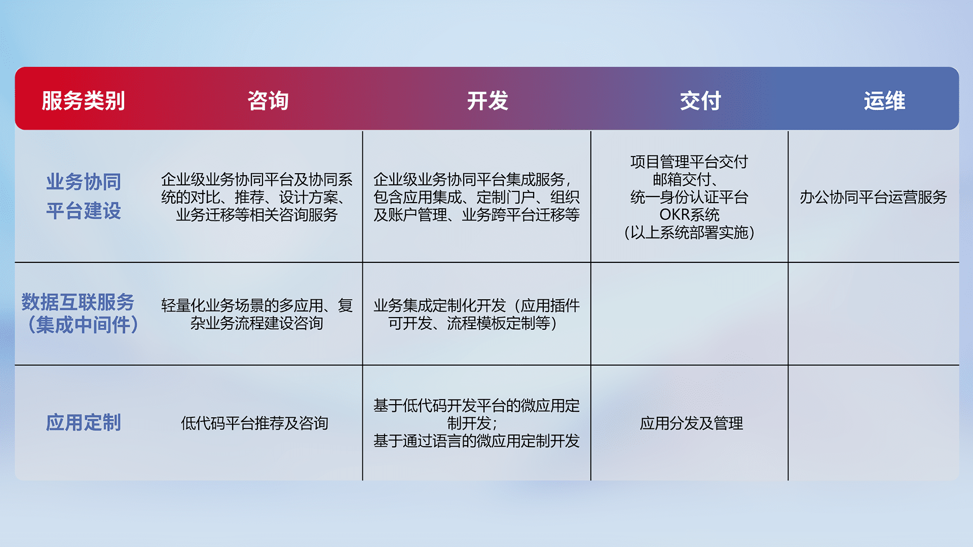 针对钉钉、、、企微、、IDaas等平台级产品提供产品的规划、、、方案、、交付、、、、定制化开发等服务,,实现如统一协同办公、、、智能客户服务、、、混合会议管理、、、智能数据查询、、等业务场景,,,实现数字化转型。。。