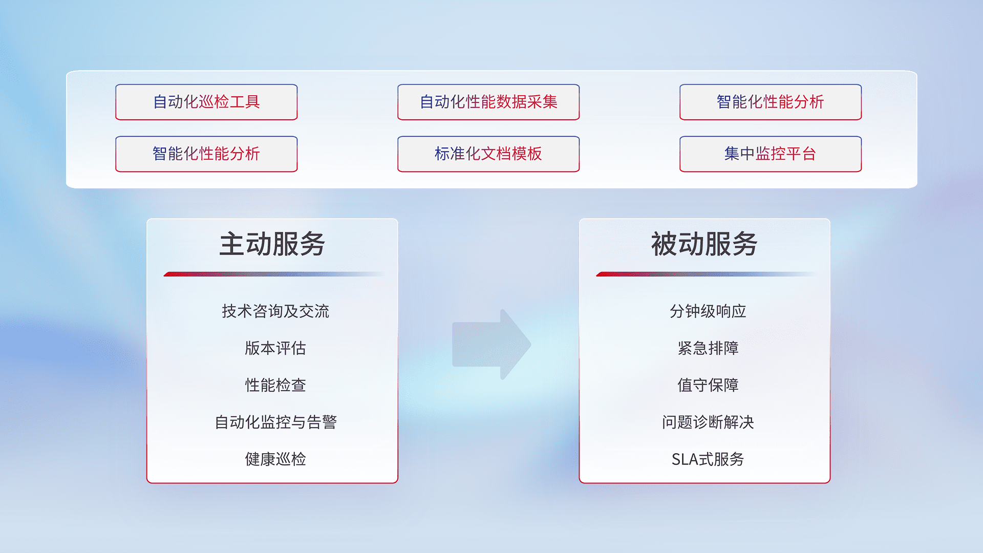 智能化工具和标准化文档,,,保障服务质量,,,提供主动服务(包含技术咨询、、、、版本评估、、、性能检查、、、自动化监控与告警、、、、健康巡检)和被动服务包含(分钟级响应、、、、紧急排障、、、值守保障、、、问题诊断解决、、、SLA服务)。。