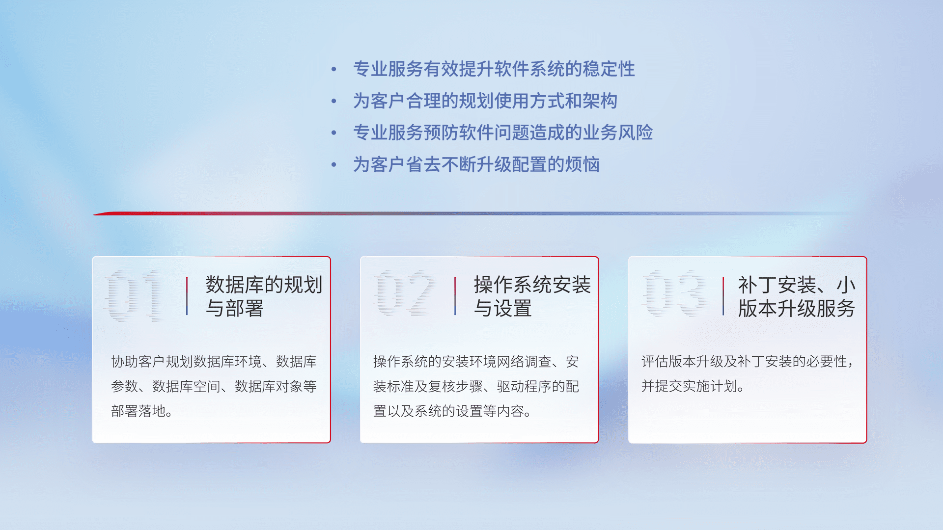 为客户提供软件规模升级、、快速部署、、、按需配置的专业服务,,,,从数据库的规划与部署到操作系统的安装与设置,,,再到补丁安装和小版本升级提供支持。。。。